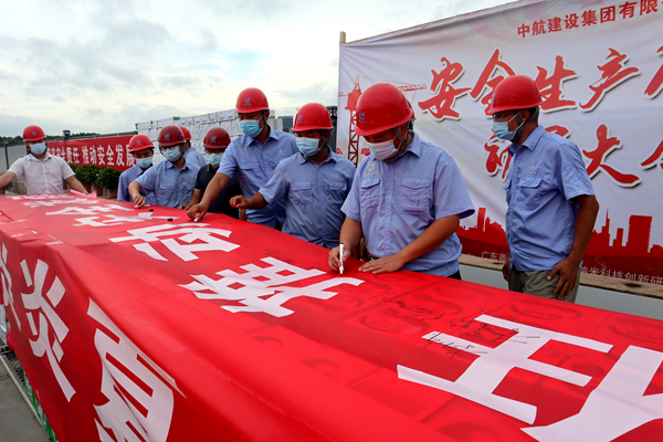 6月4日,中航建设集团承建的广州纳米生物安全中心项目部举行“安全生产月”宣誓暨夏日送清凉活动。中航建设集团南方工程有限公司执行董事张逸浩,总经理、项目总指挥徐刚,南方公司、纳米项目部全体员工以及各专业分包、劳务分包等参建单位管理人员和工人代表参加活动。
